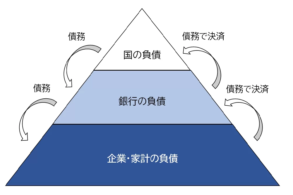 すべての貨幣は誰かの負債であります。そしてその「信用度」や「通用力」には階層があります。これは「負債のピラミッド(Debt pyramid)」と呼ばれます。ピラミッドの上に行くほど信用度が高く、決済の最終手段として機能します。ピラミッドの最上層は、政府や中央銀行が発行する貨幣です。紙幣、硬貨、および民間銀行が中央銀行に預けている「日銀当座預金(準備預金)」がピラミッドというわけです。日銀当座預金は、銀行などの金融機関が日本銀行に開設している原則、無利息の口座です。銀行間の決済、現金決済、および法定の準備預金を預け入れるために使用されます。